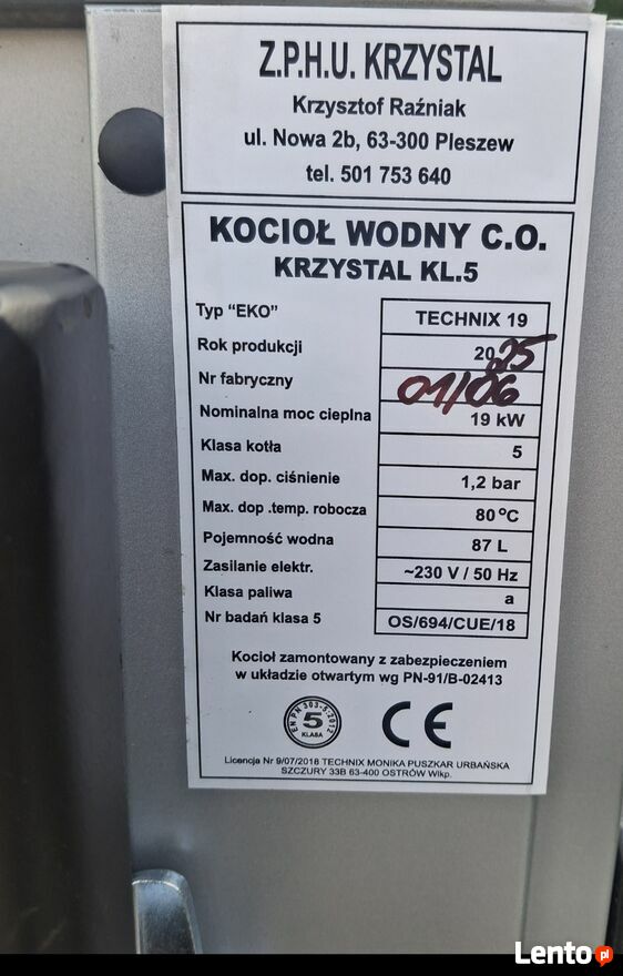 Powyżej zdjęcia Pieca wraz z tabliczką znamionową zawierającą podstawowe informacje.